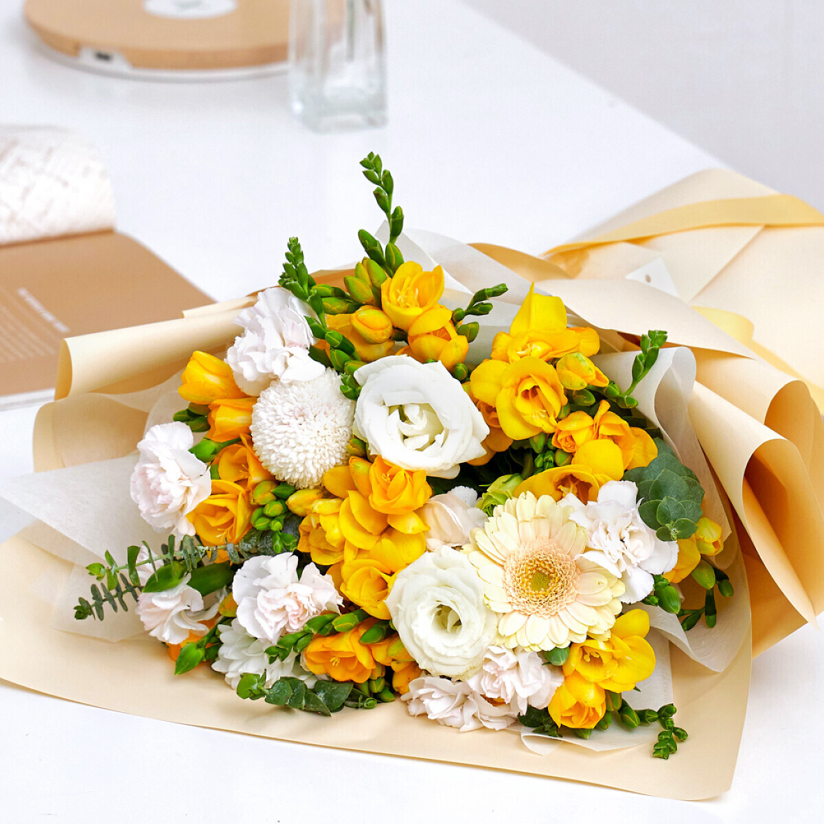 향긋한 봄을 알리는 프리지아와 화사한 계절꽃을 곁들인 프리지아 계절꽃다발