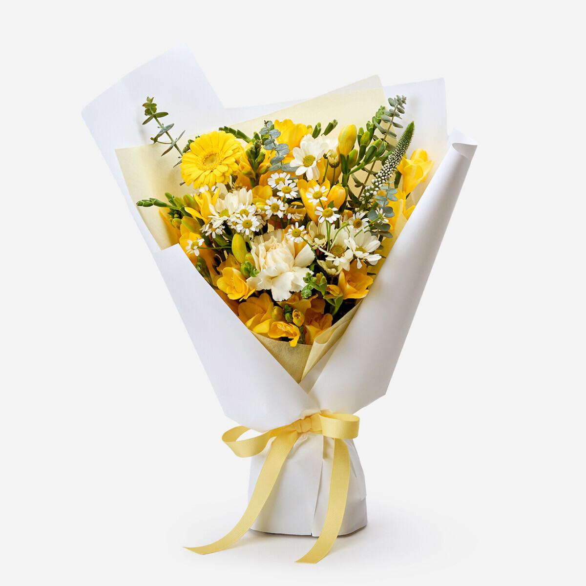 향긋한 프리지아와 계절꽃을 곁들인 프리지아 계절 꽃다발입니다.